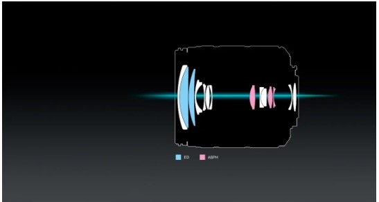 14 elementów w 12 grupach – 3 soczewki asferyczne – 2 soczewki Extra-Low Dispersion Soczewki asferyczne (ASPH) mają mniejsze rozmiary i wagę, a także zapobiegają zniekształceniom sferycznym. Soczewki Extra-Low Dispersion (ED) korygują aberracje chromatyczne, zapewniając ostry i kontrastowy obraz z czystymi kolorami na całej powierzchni.