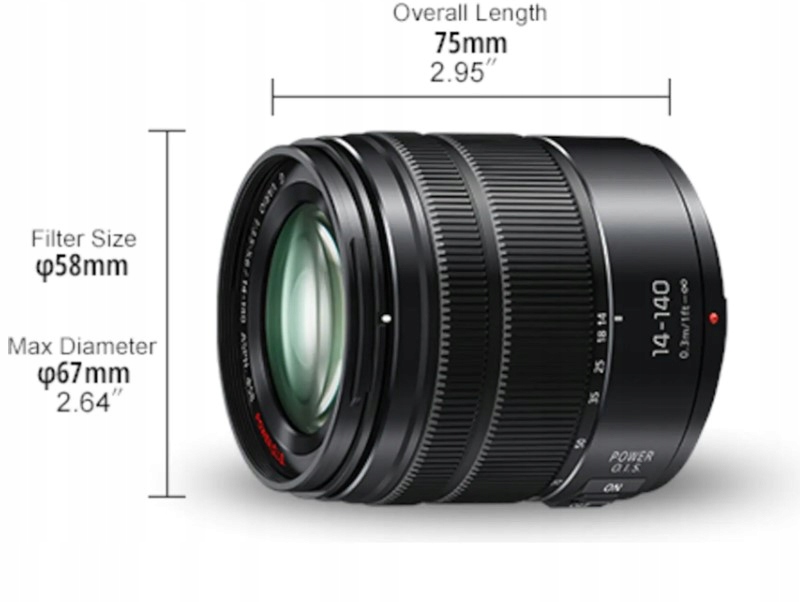 - 14–140 mm / 28–280 mm (odpowiednik w aparacie 35 mm) Długość ogniskowej